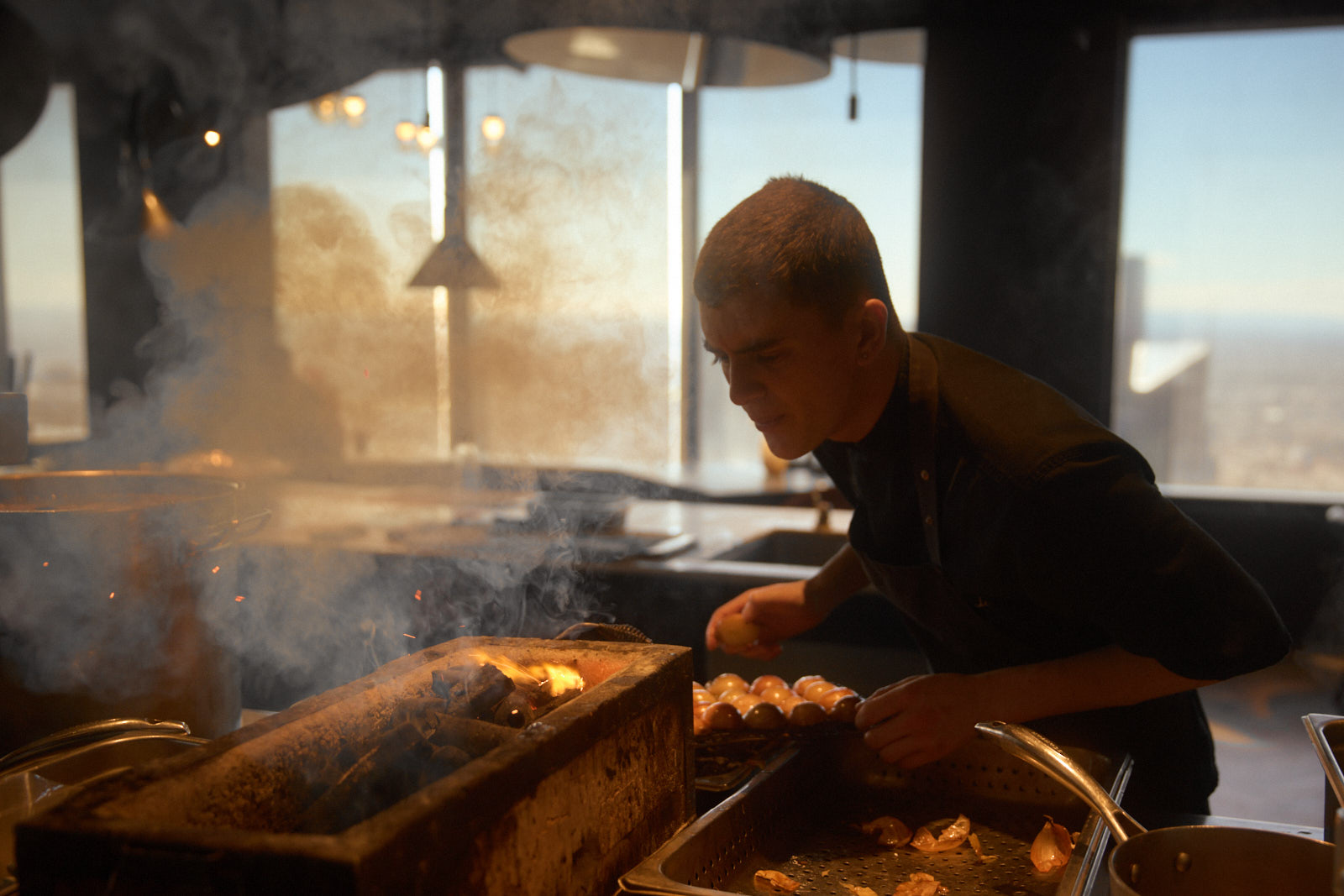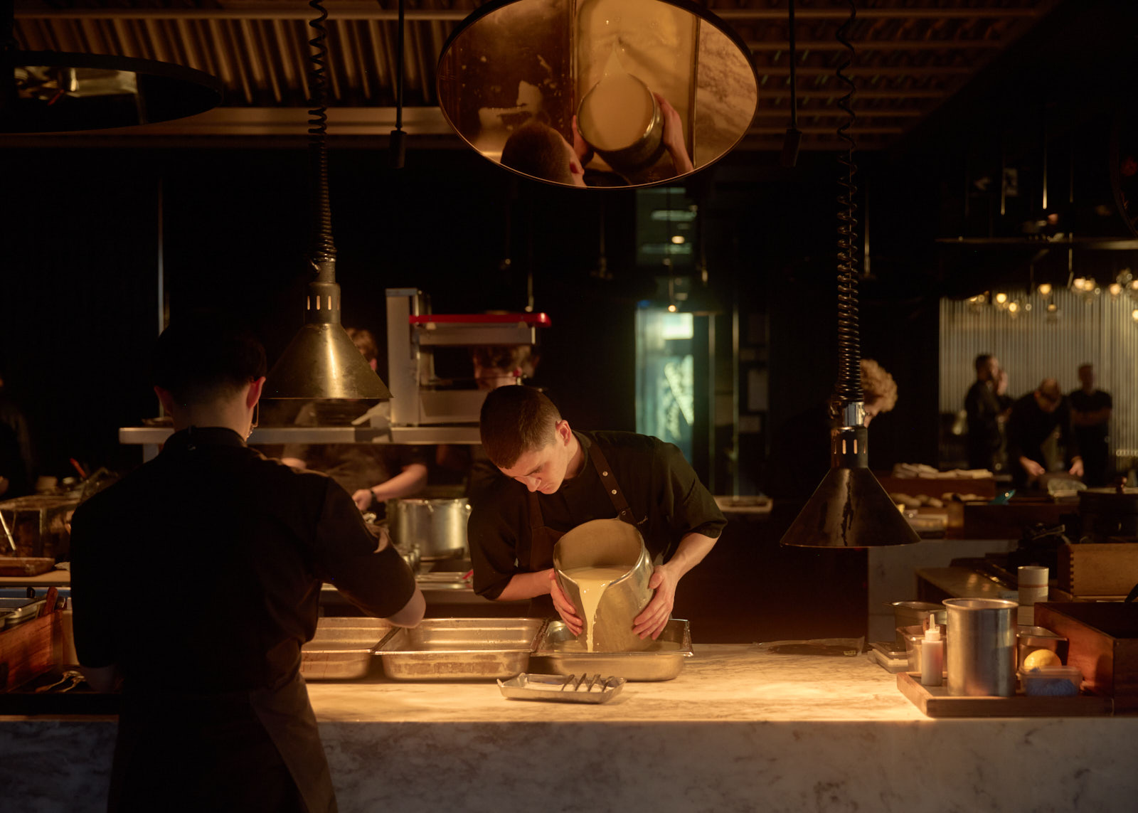 The second path is through the cellar, one wall of which is covered in stainless steel pins in a Clive Barker-esque arrangement, the other is a mirror wall. The only sounds you hear travelling through this live room are you and the people you are with. From here you emerge into the restaurant and see Joseph Kosuth’s neon sculptures of Charles Darwin’s sketchbooks; on these pages the theories of evolution were formed. The dining room is sparse, it contains timber tables covered in stretched black leather with fireflies suspended above – clusters of tiny light sculptures by Emma Lashmar. This black and light is framed by the backdrop of the panorama room, with views out to the West and towards the river estuary. The kitchen is a campfire, protruding out allowing food to be prepared off to the side. The series of chef’s tables for private dining have intimate relationships with the most exciting parts of the food preparation cycle including the events kitchen and chocolate room – inspired by ‘The Cook, the Thief, his Wife and her Lover’.